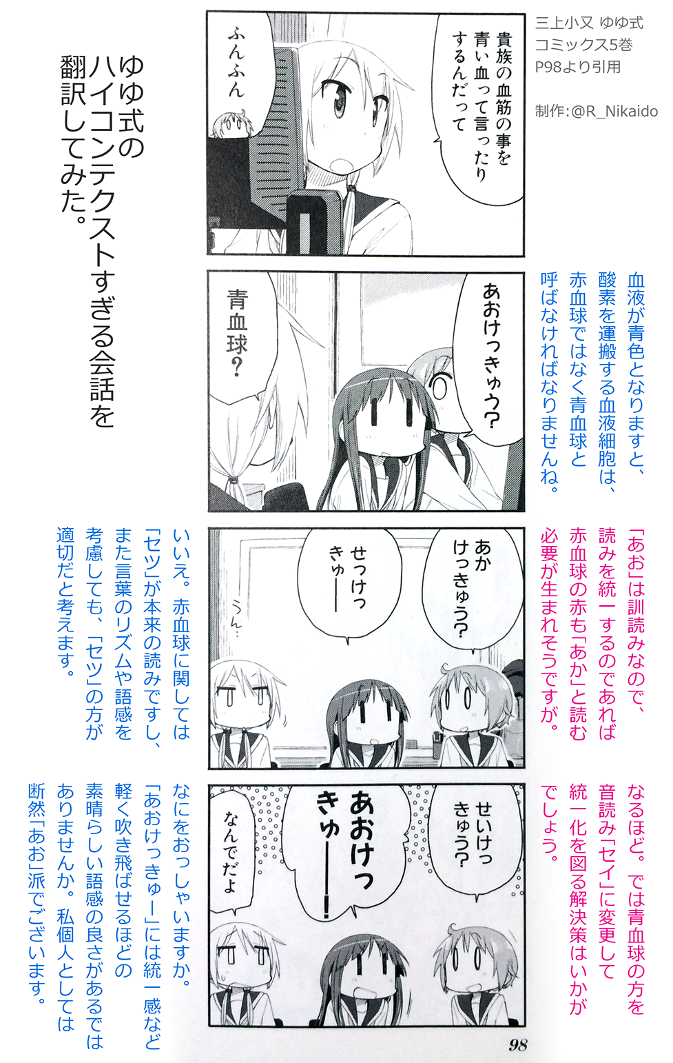 - ゆずこが「あかけっきゅう?」と言っているのは、「青血球」という言葉遊びに引っかけて、普通の「赤血球」(red blood cells)を持ち出しています。